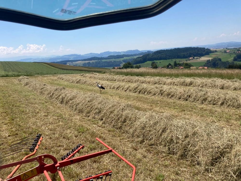 Zuerst haben wir unseren Augen nicht wirklich getraut. Plötzlich war er da und stocherte auf der gemähten Heuwiese herum. Vom laufenden Traktor mit Heuschwader liess er sich nicht beeindrucken. Nach einer halben Stunde breitete er die Flügel aus und weg war er. Das erste Mal, dass wir hier einen Storch beobachten konnten.