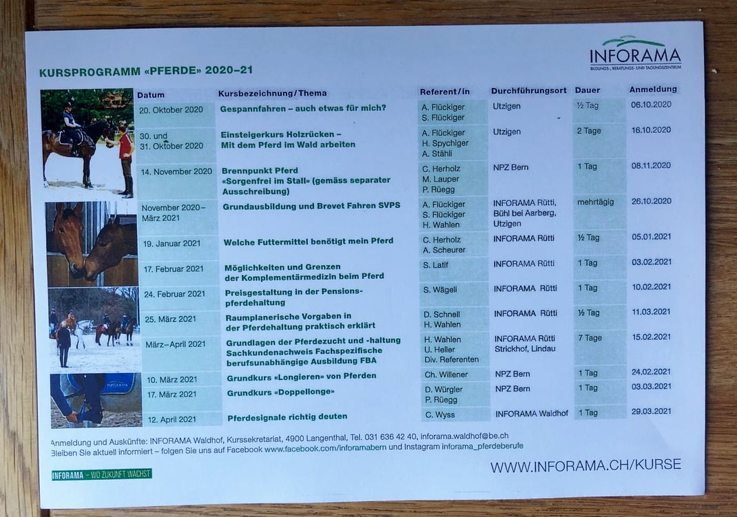 Ende Oktober 2020 findet ein Einführungskurs in die fachgerechte Waldarbeit mit Pferden statt (Waldstück im Utzigen-Wuhlwald). Im November beginnt wiederum ein Kurs "Grundausbildung Pferd Fahren und Brevet Fahren". Wir sind als Instruktoren in die Kurse involviert und haben die techn. Leitung für die Grundausbildung Pferd Fahren und Brevet. Weitere Infos siehe die zwei Flyer und www.inforama.ch/kurse: