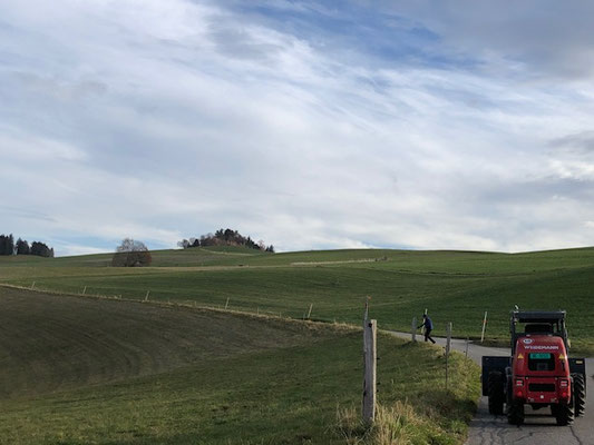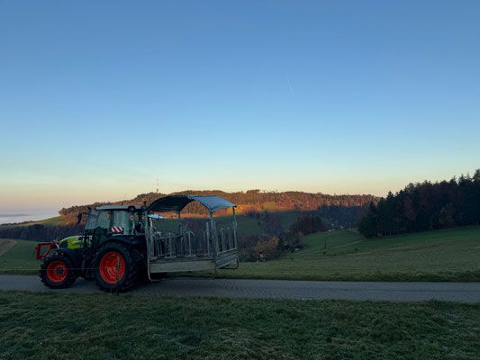 Die Weidesaison dauerte lange dieses Jahr. Nun, mit dem angekündigten Wetterumschwung, geht sie zu Ende. Das bedeutet auch, die Zäune müssen abgeräumt werden. Die Tiere haben wir heute auf die zwei Laufställe mit Strohläger und permanent zugänglichen Aussen-Laufhöfen aufgeteilt. Die Kühe mit den ganz kleinen Kälbern behalten wir zusammen und diejenigen mit dem älteren Nachwuchs kommen in den andern Stall. Auch die Heuraufe, in welcher zum Herbstgras auf der Weide noch Heu gereicht wurde, "rollte" heim.